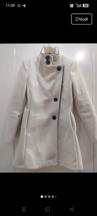 Elegante cappotto di colore bianco, perfetto per completare il tuo outfit. - Chiusura con bottoni neri. - Dettagli a contrasto sul colletto e sui revers. Difetto! Piccolissimi puntini scuri e striatura scura sulla schiena come da foto.