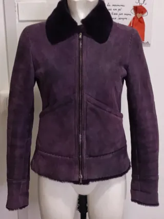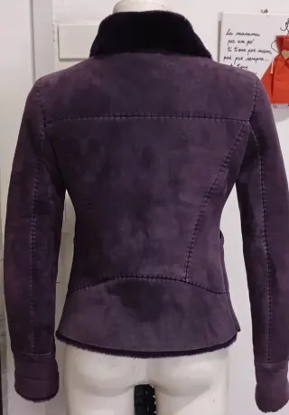 Elegante montone da donna in un vivace color viola. Presenta un colletto in pelliccia scura e una chiusura zip frontale.taglia italiana 42.vestibibila'stretta - Materiale scamosciato. - Dettagli in pelliccia sul colletto e sui bordi. - Design corto e aderente.