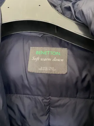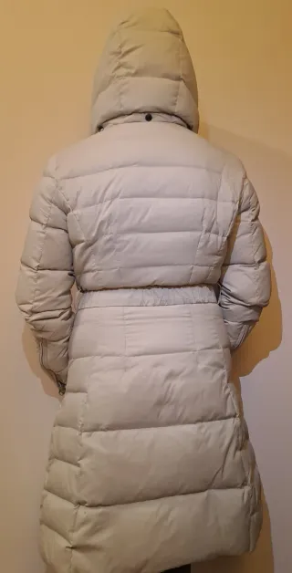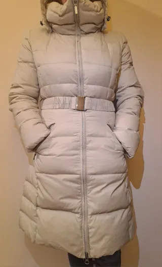 Cappotto caldo piumino Benetton color beige. Presenta una cintura elastica in vita con fibbia metallica. Segna il punto vita. - Cappuccio integrato. - Chiusura frontale con zip. - Tasche laterali.