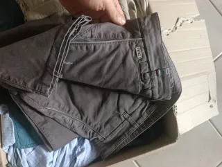 Lotto misto di 15 capi di abbigliamento da uomo, ideali per rivenditori o per chi cerca un assortimento. Capi firmati per rivendita cappotti, gilet, pantaloni nero giardini - Pantaloni in tessuto color beige. - Pantaloni in tessuto color marrone. - Cappellino blu scuro con stampa. - Altri capi di abbigliamento assortiti.