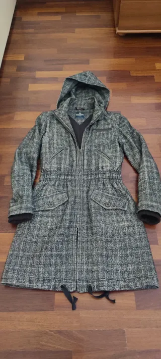 Cappotto donna lunghezza ginocchio, ottimo prodotto in lana e cotone come si vede etichetta in foto, polso in maglia morbida colore marrone, cappuccio staccabile regolabile internamente, tenuto molto bene, caldo e di qualità. - Motivo a quadri. - Cappuccio integrato. - Chiusura frontale con zip. - Coulisse in vita per una vestibilità regolabile. - Tasche frontali con patta.