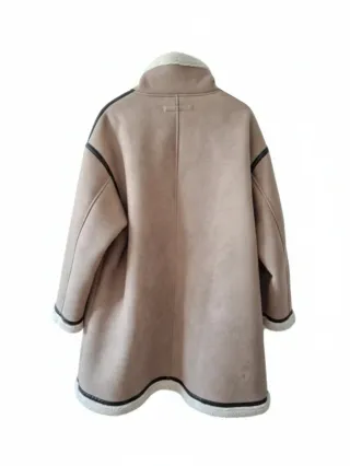 Elegante cappotto in montone beige, perfetto per le giornate più fredde. Presenta un design moderno e confortevole. - Cappuccio integrato. - Fodera interna in morbido tessuto. - Due tasche frontali applicate. - Chiusura con bottoni. Taglia XL