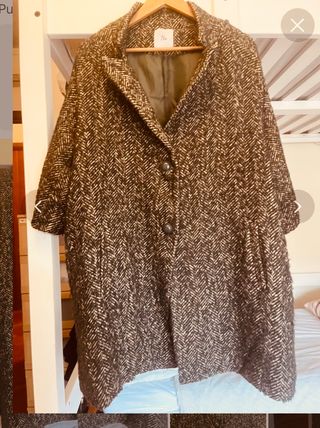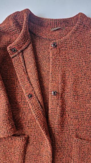Soprabito in lana grezza firmato C_amm, dal design essenziale e materico. Taglia unica, senza cartellino, con vestibilità XL donna. Misure: spalle 58 cm, lunghezza 94 cm, maniche 44 cm. Chiusura anteriore con bottoni a clips e due tasche frontali. Colore caldo, tra ruggine, mattone e terracotta, con effetto mélange. Capo ben tenuto, ideale per mezza stagione e inverno.