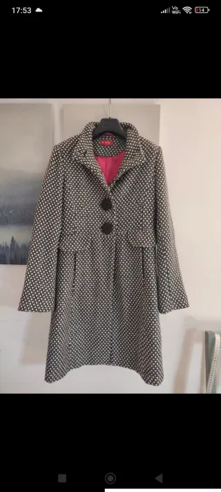 Elegante cappotto vintage firmato Derhy, perfetto per aggiungere un tocco di stile al tuo guardaroba. - Fantasia geometrica in bianco e nero. - Fodera interna color fucsia vivace. - Chiusura con bottoni scuri. - Taglio classico e femminile.