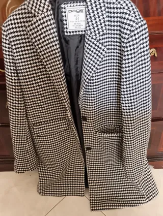 Caldo cappotto da donna con fantasia a quadri. Taglia L, adatto per busto 95-101 cm, vita 75-81 cm, fianchi 100-106 cm e altezza indicativa 175-180 cm, con circonferenza petto cappotto 110 cm e lunghezza 82 cm come da tabella in foto. - Fantasia a quadri bianco e nero. - Taglia L.