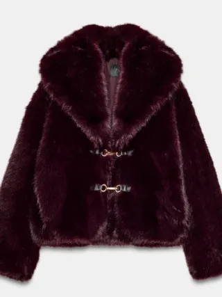 Elegante cappotto corto in finta pelliccia color bordeaux. Presenta una chiusura con ganci dorati e dettagli in ecopelle. - Morbido al tatto - Collo ampio - Chiusura con ganci