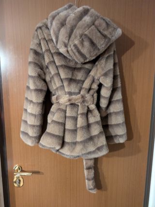 Elegante pelliccia ecologica con un design a righe orizzontali. - Morbida al tatto. - Cintura in vita per un fit personalizzabile. - Cappuccio integrato.
