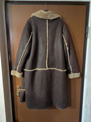 Questo è un cappotto lungo in stile vintage, realizzato in ecopelle scamosciata con finiture e collo in ecopelliccia. Lungo fino alla caviglia per me che sono alta quasi 1,70 metri. Pelliccia anche all’interno (vedi foto). Perfetto per la stagione invernale ma anche in primavera ed autunno. Le pelliccia sono tornate di moda, i cappotti sono sempre una garanzia, e questo capo li racchiude entrambi. Le particolarità sono: - la chiusura con questi due lacci sul davanti; - i disegni dietro la schiena che armonizzano la silhouette del cappotto; - tutti i dettagli in fili di ecopelliccia. Nuovo. Usato solo una volta. Marca Ness