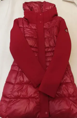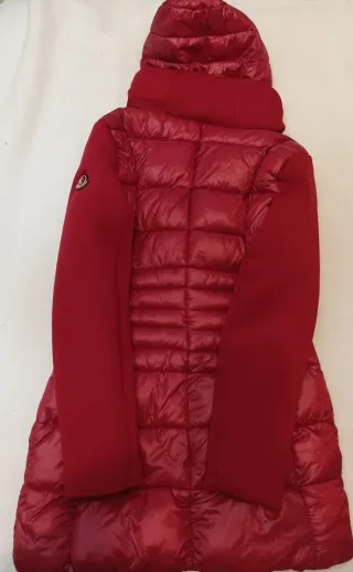 Elegante cappotto/ piumino Moncler di colore rosso (parallelo). - Design trapuntato. - Logo Moncler sul braccio.
