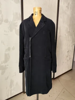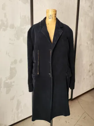 Cappotto originale Belstaff primi anni 2000, lungo e strutturato, realizzato in 80% lana rasata con effetto morbido e quasi vellutato al tatto. Design distintivo con zip leggermente decentrata sul lato destro e inserti rettangolari in pelle nera sui gomiti, elementi originali del modello. La lana è in condizioni perfette, compatta e ben tenuta. La pelle presenta lievi segni naturali che ne valorizzano il carattere vintage. Composizione: 80% lana, 20% nylon Imbottitura 87% lana, 13% nylon Fodera maniche 60% viscosa, 40% cotone Colore: nero Taglia: L Vest