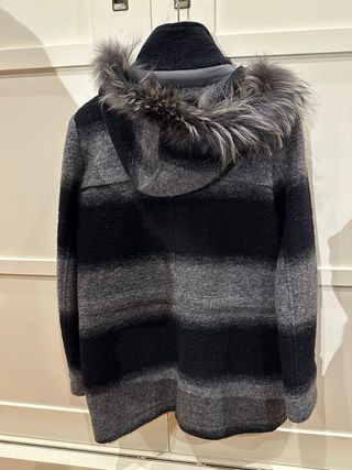 Elegante cappotto da donna, perfetto per le giornate più fredde. - Dettagli in pelliccia sul colletto e sui polsini. - Chiusura doppiopetto con bottoni. - Lunghezza al ginocchio.