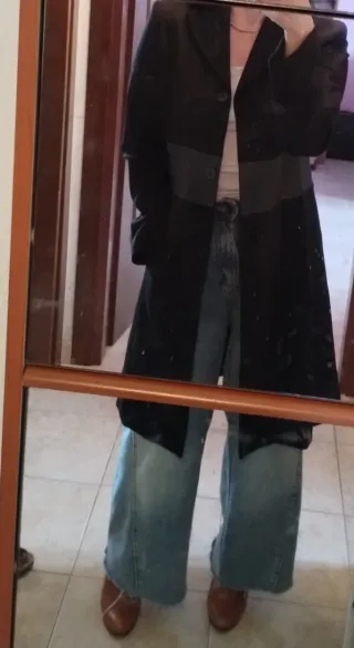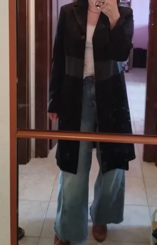 Cappotto sfoderato, perfetto per la mezza stagione. Presenta un design moderno con coulisse in vita per una vestibilità personalizzabile. - Tessuto morbido e confortevole. - Tasche laterali pratiche. - Chiusura con laccetto. - È sporco al interno,ultima foto. Non ho lavato per sapere se va via