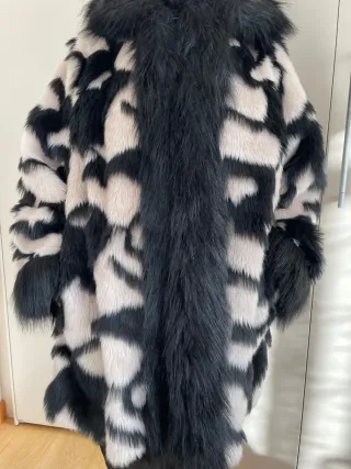 Elegante pelliccia sintetica da donna con una fantasia unica. Co n cappuccio e 2 tasche - Morbida al tatto. - Design accattivante.