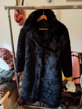 Elegante pelliccia sintetica nera, perfetta per aggiungere un tocco di classe al tuo guardaroba. - Morbida al tatto. - Design lungo e avvolgente. - Chiusura frontale con bottoni.
