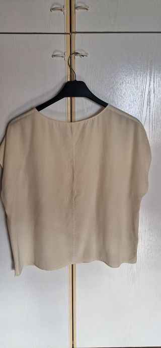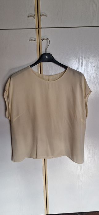 Bellissimo top corto color beige, perfetto per la primavera o l'estate. - Realizzato in tessuto leggero e fluido. - Modello a maniche corte. - Vestibilità comoda e rilassata.