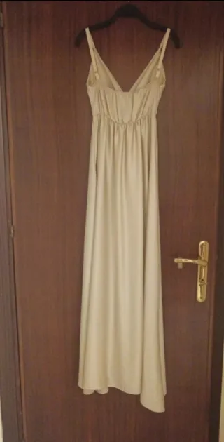 Elegante vestito lungo color beige, perfetto per ogni occasione. - Tessuto leggero e fluido. - Scollo a V. - Spalline sottili.
