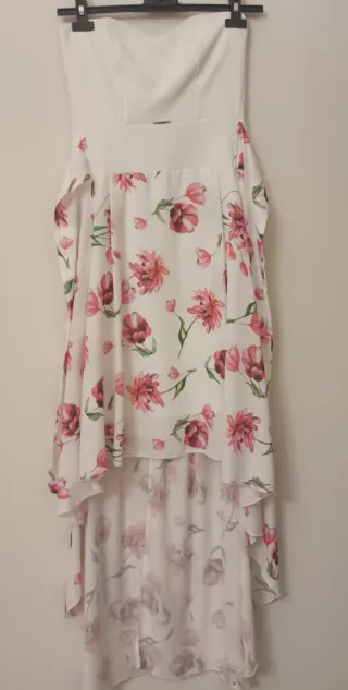 Vestito da ragazza con stampa floreale. Il modello è senza spalline corto davanti e lungo dietro,con cintura della stessa stoffa in vita. Vestito taglia 40 Giacchino taglia 42 - Stampa floreale con fiori rosa e verdi. - Tessuto leggero e svolazzante. - Lunghezza asimmetrica.