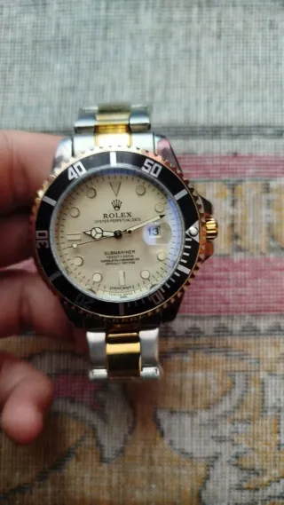 Orologio Rolex Submariner con cassa in oro e acciaio. - Lunetta girevole unidirezionale nera. - Quadrante color crema. - Datario a ore 3. - Bracciale Oyster in oro e acciaio.