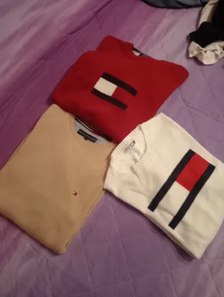 Lotto composto da tre maglioni in cotone. - Un maglione color beige con piccolo logo. - Un maglione rosso con logo Tommy Hilfiger. - Un maglione bianco con logo Tommy Hilfiger.
