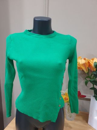 Elegante blusa Intimissimi a coste, con un diseño moderno y detalles únicos. - Color verde vibrante. - Talla M. - Tejido acanalado. - Detalle de botones dorados en el lateral.