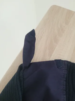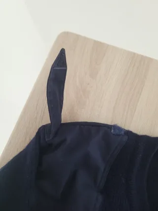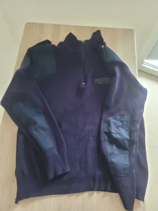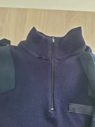 Maglione in lana blu scuro, ideale per il lavoro o per le giornate più fredde. - Patch rinforzate su spalle e gomiti. - Collo alto con zip. - Spalline col bottone