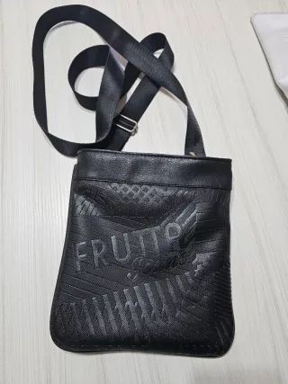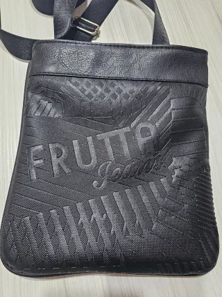 Tracolla Frutta in ecopelle nera. - Design con logo Frutta Jeans in rilievo. - Texture a rombi e righe. - Tracolla regolabile.