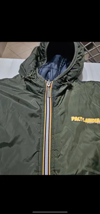 Giubbino piumino con cappuccio e zip frontale. Double face. - Zip a contrasto con dettagli colorati. - Logo giallo sul petto.