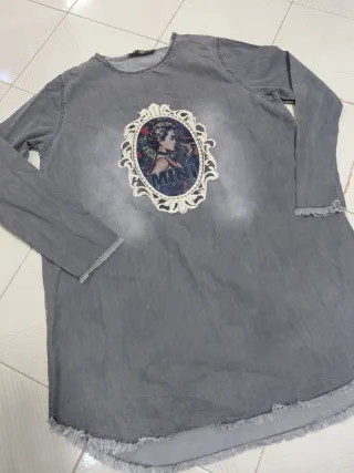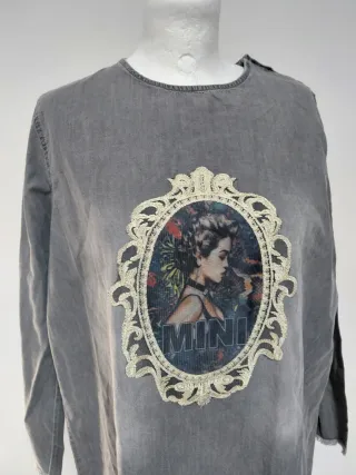 Abito grigio con una stampa decorativa incorniciata. - Stampa raffigurante un volto femminile in stile vintage. - Dettaglio con scritta MINI all'interno della stampa. - Bordo inferiore e maniche con frange. - Tessuto effetto denim.