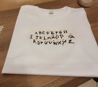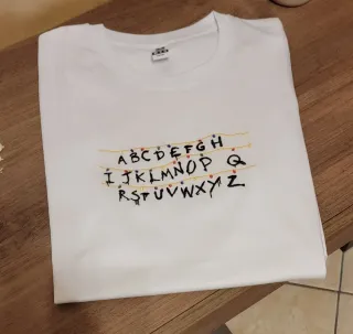 Maglietta bianca con un design ricamato ispirato a Stranger Things. - Alfabeto ricamato. - Luci colorate decorative.