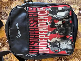 Tracolla verticale Vespa con stampa Unsurpassable Independence e immagini di persone su scooter. - Logo Vespa. - Stampa a tema.