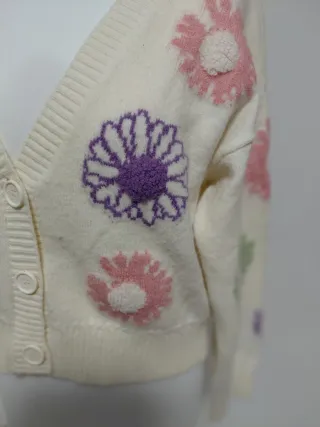 Cardigan da donna con un grazioso motivo floreale. - Design con scollo a V. - Chiusura con bottoni. - Applicazioni floreali in rilievo.