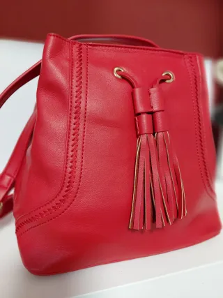 Elegante borsa a secchiello in pelle. Presenta dettagli con cuciture decorative sui lati e una chiusura a coulisse con nappe pendenti. - Materiale: pelle - Colore: rosso - Dettagli: nappe decorative, cuciture a contrasto
