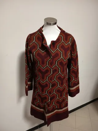 Elegante abito da donna con fantasia colorata. Perfetto per diverse occasioni. - Tessuto bouclé con fili lurex. - Scollo a V. - Maniche corte a sbuffo. - Cintura in vita da annodare. - Chiusura con bottoni.
