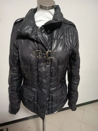 Elegante giubbino nero con dettagli unici. - Chiusura frontale con zip e fibbia decorativa. - Collo alto con bottoni a pressione. - Tasche frontali con patta. - Maniche lunghe. - Dettagli trapuntati sulle spalle.