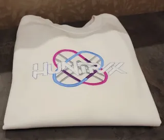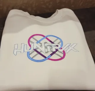 Felpa bianco panna con un design unico sul petto. Ricamo alta qualità - Logo HUNTRX stilizzato. - Motivo intrecciato in blu, fucsia e viola. Unisex