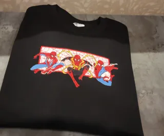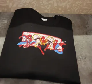 Felpa nera con ricamo a tema Spider-Man. con tre versioni di Spider-Man. - Design colorato su sfondo bianco e rosso.
