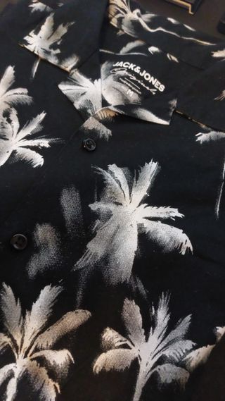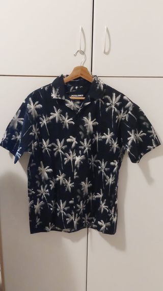 Camicia a maniche corte con stampa a tema floreale. - Fantasia con palme su fondo scuro. - Collo a campana. - Logo Jack&Jones visibile sull'etichetta interna.