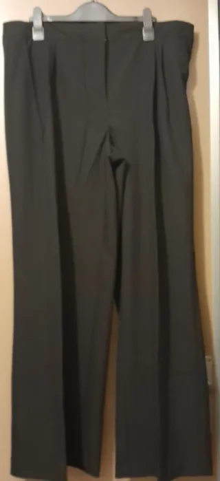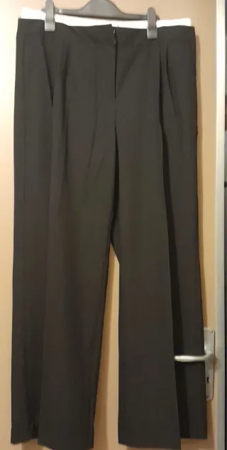 Pantaloni neri eleganti da donna. Vita alta e tasche laterali.Gamba dritta e molto larga. I pantaloni presentano una doppia chiusura in vita, una in cotone bianco che può essere tolta senza alterare la struttura dei pantaloni. Il tessuto è misto viscosa, poliestere e poco elastan. Venduti per una taglia 48 vestono grande, più indicati per una 50. La parte in cotone bianco è con elastico che è a riposo 90 cm.,se tolta la misura della vita ferma in nero è 98 cm