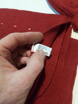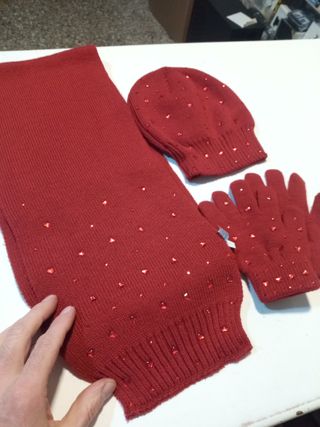 set coordinato di sciarpa, cappello e guanti in maglia rossa con strass. Taglia S/M , come da foto