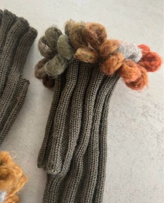 Guanti senza dita realizzati a mano in maglia con un foro per il pollice. Presentano un bordo decorativo con fiori in filato. - Design a coste. - Dettagli floreali colorati.