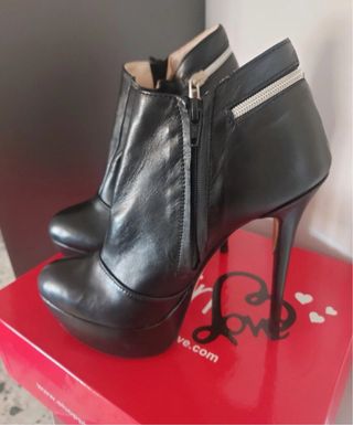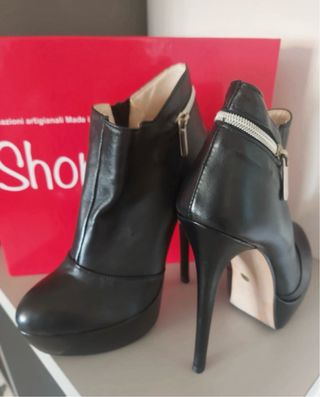 Eleganti e sexy stivaletti con tacco alto e plateau, zip interna e dettaglio con cerniera - Zip laterale per facilitare la calzata. - Design moderno e audace. - Suola con plateau. Taglia 39 Altezza tacco 14,5 cm Altezza plateau 3,5 cm