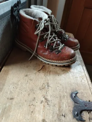 Scarponi in pelle di alta qualità, all'interno doppiata con lana colorata, perfetti per le gite in montagna. La suola a carrarmato è praticamente nuova, l'allacciatura tradizionale permette l'adattabilita' ad ogni piede. - Materiale: Pelle - Taglia: 44 - Colore: Nero