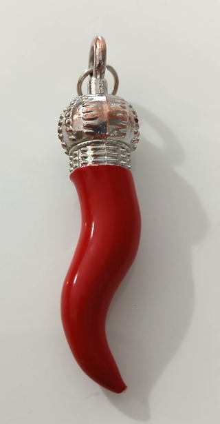 Un ciondolo a forma di corno portafortuna, con un dettaglio a corona argentata. - Design a cornetto. - Dettaglio superiore a corona. Ciondolo Portachiavi Corno Cornetto Portafortuna Rosso Vintage in buone condizioni come da foto