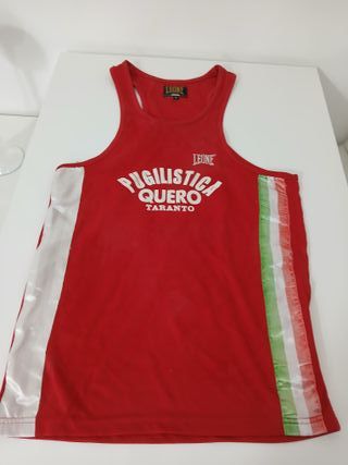 Canotta sportiva Leone, perfetta per il pugilato. Presenta dettagli a contrasto sui lati. - Logo Leone sul petto. - Scritta Pugilistica Quero Taranto stampata. - Inserti laterali bianchi. - Strisce tricolore (verde, bianco, rosso) sul lato destro. Canotta Leone Taglia S Rosso Boxe Pugilistica Quero Taranto in buone condizioni come da foto