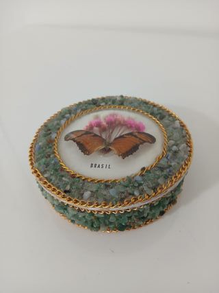 Elegante cofanetto vintage, perfetto per custodire piccoli oggetti preziosi. La decorazione presenta una farfalla e fiori secchi incastonati nella resina, con la scritta BRASIL. - Bordi decorati con pietre verdi e catena dorata. - Coperchio con farfalla e fiori. - Scritta BRASIL sul coperchio. Scatola Cofanetto Portagioie Vintage Brasile con Farfalla Vera e Pietre Preziose In ottime condizioni come da foto