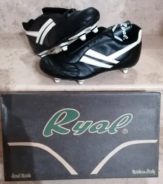 Scarpe da calcio Ryal in pelle, numero 39. - Modello con 6 tacchetti. - Design a 3 fasce bianche laterali. - Logo Ryal sulla linguetta. - made in Italy