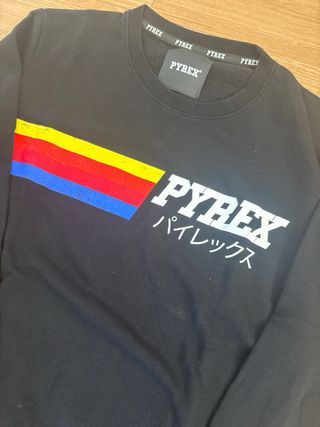 Felpa Pyrex usata pochissime volte, in ottime condizioni. - Logo Pyrex sul petto. - Dettaglio a banda colorata (giallo, rosso, blu). - Scritta in giapponese sotto il logo.