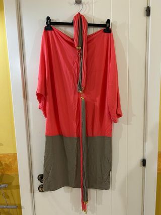 Abito estivo bicolore con sciarpa coordinata. - Parte superiore color corallo. - Parte inferiore color verde oliva. - Sciarpa con dettagli dorati e nappine.