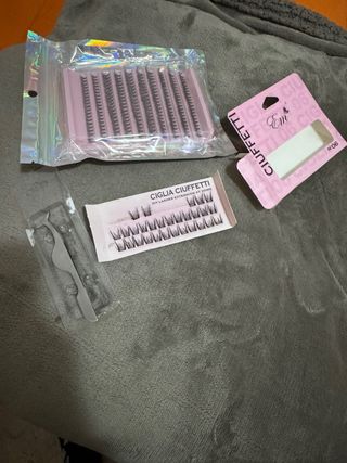 Set di ciglia finte per extension fai-da-te. - Ciglia a ciuffetti,nella confezione aperta ne mancano alcune come da foto. - Marca Em. - Colore nero. il pacco grande e’ancora sigillato e nn aperto contiene 120 pz pinzetta
