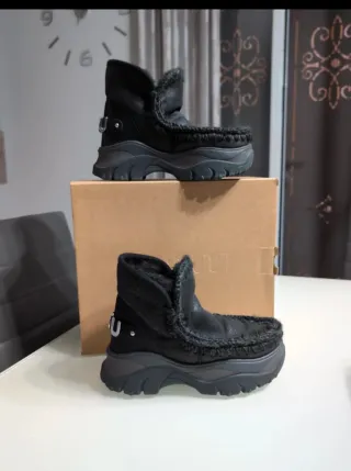 Stivali MOU neri con un design moderno e suola platform. - Materiale esterno in pelle scamosciata. - Fodera interna in pelliccia sintetica. - Dettagli con cuciture a vista. - Chiusura con fibbia sul retro.